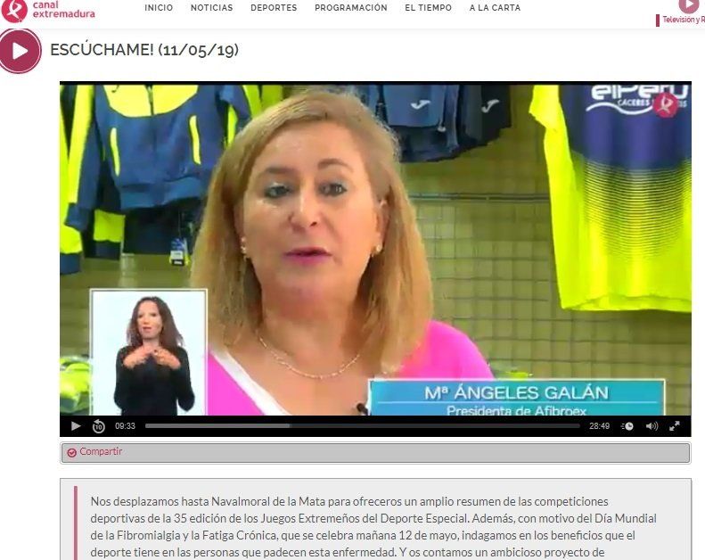 Reportaje grabado por Canal Extremadura en el que se da una amplia visión de qué es y cómo se vive con Fibromialgia y los recursos de nuestra asociación para acompañar a las personas diagnosticadas.